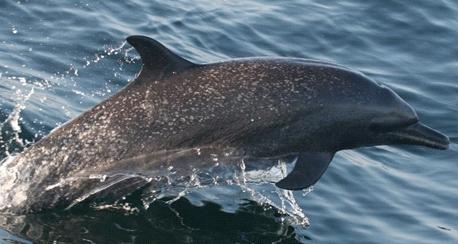Delfín moteado joven (izquierda) y adulto (derecha) en costas de Colima. Nótese la presencia de las manchas en la etapa adulta. Autor: Grupo Universitario de Investigación de Mamíferos Marinos (GUIMM) de la Universidad de Colima. Enero 2010.