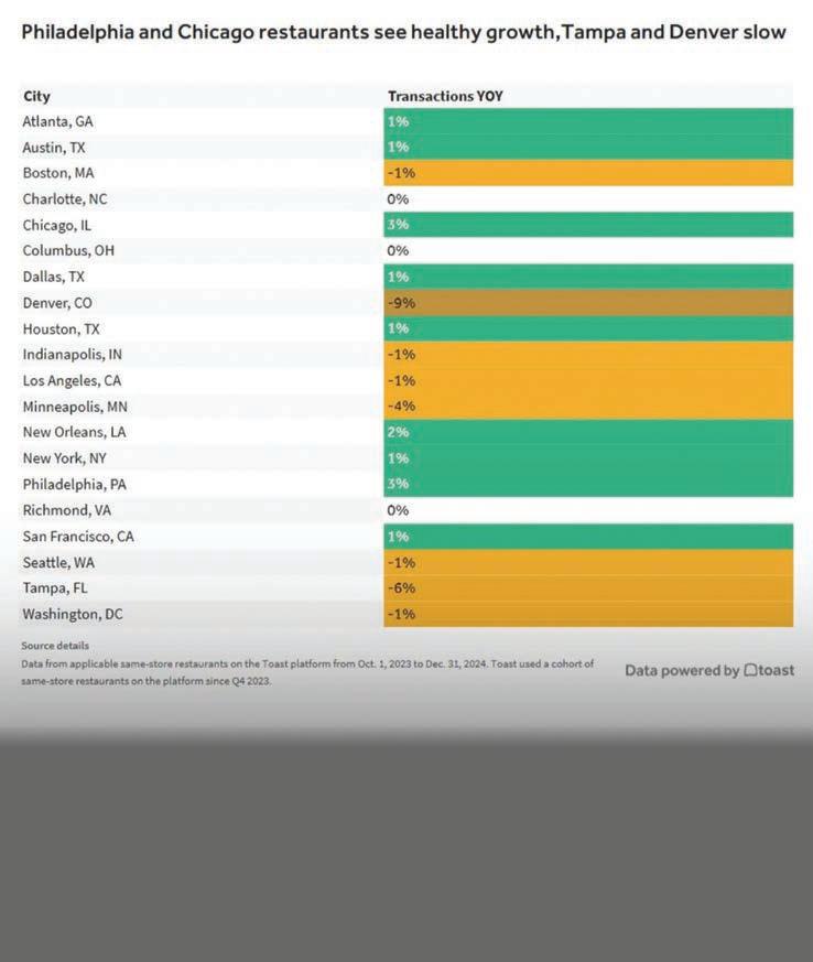 Los datos de TOAST sobre las transacciones interanuales (YOY) de restaurantes revelaron un contraste marcado en el rendimiento entre las ciudades. Mientras que ciudades como Filadelfia y Chicago vieron un crecimiento positivo, con un aumento del 3% cada una, Denver y Tampa enfrentaron una desaceleración drástica. La caída del 9% en las transacciones de Denver destaca, seguida por Tampa, Florida, con una disminución pronunciada del 6%.
