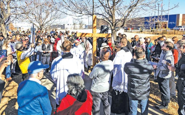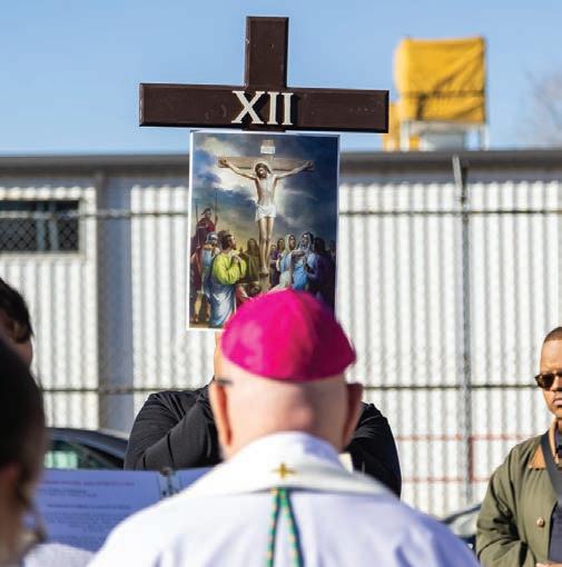 por el deseo de elevar una plegaria. Y me refiero que la aspiración es que los migrantes no sigan cargando cruces invisibles en silencio. Escuché testimonios de personas que han sufrido explotación laboral o temen no volver a casa por miedo a la deportación. Sus palabras se mezclaban con los rezos, recordándonos que este viacrucis es también una denuncia, una forma de hacer visible un dolor que a menudo se ignora. El recorrido concluyó frente al centro de detención, donde el arzobispo Aquila y el obispo Rodríguez dirigie-