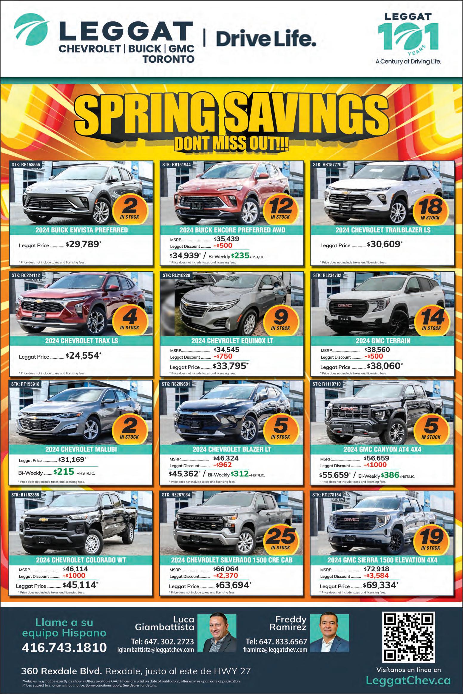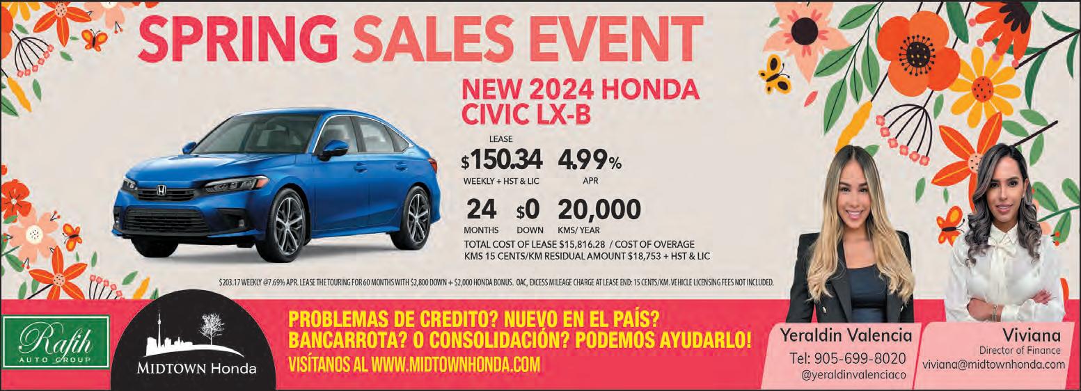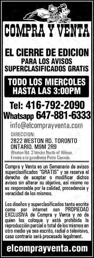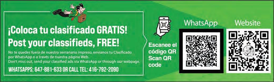 www.elcomprayventa.com Tel: 416-792-2090 | WhatsApp: 647-881-6333 CLASIFICADOGRATIS FREECLASSIFIEDS CLASIFICADOGRATIS FREECLASSIFIEDS Siempre La Mejor Solución The Latin Way to Buy & Sell DE COMPRA Y VENTA EST. 1993 GRATIS | FREE MAY 10 al 16, 2024 EDICIÓN 18 Sección 1 de 2