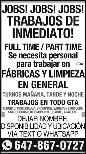 155.000 Km, motor y transmisión en excelente estado, venta por partes o completa $1500 o Mejor Oferta. Llamar al Tel: 647-231-4180 (23) Equinox SUV, buenas condiciones, mantenimiento a tiempo, discos de frenos nuevos más cambio de aceite. $3,000. Llamar al Tel: 647-393-5118 (23) Vendo Zapatillas Skechers, de hombre T: 12, Perfecto Estado $40. Llamar de 12pm a 5pm al Tel: 416-241-4487 (24) Vendo Chaqueta de cuero Italiano, de Caballero, T: Doble X, color negro $100. Llamara al Tel: 416241-4487 (24) Vendo Zapatos de Seguridad, #7, para mujer, color marrón, $30. Llamar al Tel: 437-2181409(22) Vendo Zapatos de Seguridad, #8, poco uso , color gris, $30. Llamar al Tel: 437-218-1409(22) Vendo Pantalón Nuevo para hombre de construcción, talla 34 con raya de seguridad luminosa amarilla, nuevo, $30. Llamar al Tel: 437VIERNES 21 DE JUNIO, 2024 37 WhatsApp 647-881-6333 (T14)