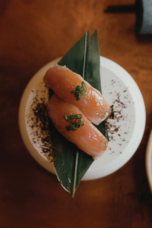 Aquí es donde realmente entra en juego la atención al detalle. Cada plato del menú ha sido minuciosamente diseñado y probado una y otra vez hasta lograr la perfección absoluta. Incluso se pensó cuidadosamente al nombrar cada plato. Joerick usó el rollo de Miyu como ejemplo: “En japonés, Miyu significa belleza. El rollo de Miyu es hermoso, tiene todos los colores, rojo, naranja, verde, blanco y negro. Tiene diferentes texturas, es crujiente, es cremoso, es picante, es dulce. Es hermoso y perfecto. Soy una persona muy conceptual y cuando me enfoco en el concepto de un restaurante no me desvío. El concepto de Bakku es un restaurante tradicional japonés. Nunca encontrarás fideos, pad thai o arroz frito en nuestro menú. Los sabores y cada elemento del menú son completamente tradicionales para la cocina japonesa.”