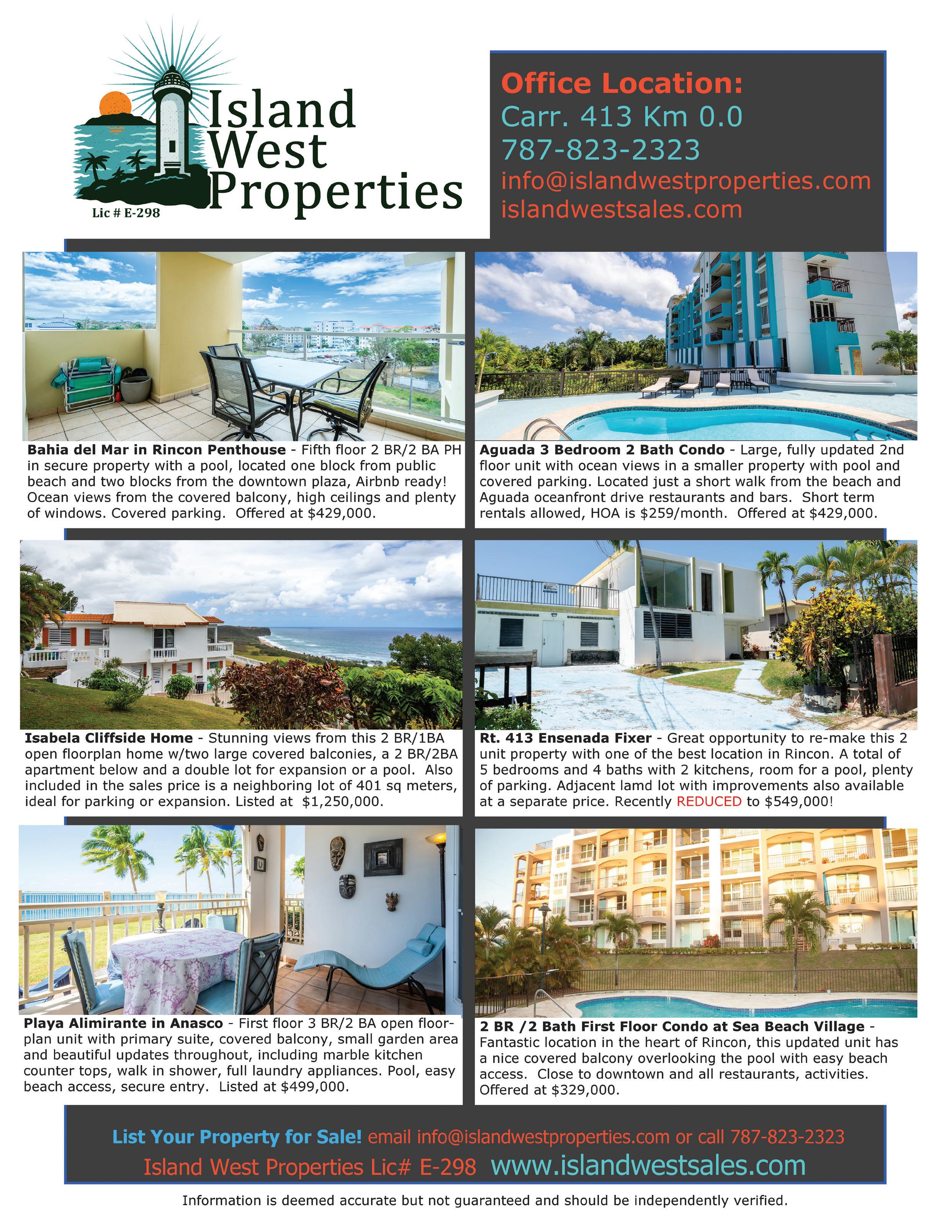 Hurricane Maria Twelve-year Rincón resident James Westfall, the owner of Island West Realty since 2017, experienced a positive effect of the market that, ironically, is linked to the harm caused by hurricane Maria: “A whole new batch of people realized Puerto Rico was part of the United States. Aid workers came, some stayed, or went home and talked up the island. Suddenly Puerto Rico was on the map.” Clientele grew. In addition, Puerto Ricans who had moved away sometimes invested with the belief that it would help get the island back on its feet. Others speculated that the hurricane’s aftermath was a time to buy-low and later sell high. The awful challenges of Maria, ironically, became opportunities in real estate. JM Realty’s Troche seconds Westfall’s recollection: “We had our best year of our careers after Maria.”