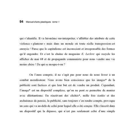 qui s’identifie. Il va lui-même sur-interpréter, s’affubler des attributs de cette violence « glamour » mais dans un monde où toute réelle transgression est enrayée ! Parce que le capitalisme est inconscient et irresponsable des formes qu’il engendre. Et c’est la chaîne de magasins E. Leclerc qui recycle les affiches de mai 68 et de propagande communiste pour nous vendre une vie moins chère ! De qui se moque-t-on ? On l’aura compris, il ne s’agit pas pour nous de nous livrer à un combat moralisateur. Nous avons bien conscience que les images* de la publicité sont factices et que leur but est de vendre un produit. Cependant, l’image* est un dispositif complexe, qu’on ne peut se permettre de manier avec dilettantisme. En réactivant des clichés*, mille fois éculés et des archaïsmes de pensée, la publicité, sans toujours s’en rendre compte, provoque un sens qui va au-delà de celui pour lequel elle a été conçue. Elle s'inscrit dans un dispositif qui la dépasse, qui n’est pas seulement celui d’une simple
