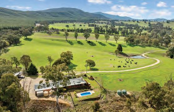 hobby farming or eco-tourism. It includes fenced paddocks, dams, rainwater storage and versatile shedding. Located 20 minutes from Beechworth, 30 minutes from Wangaratta and three hours from Melbourne, it combines seclusion with excellent regional accessibility.