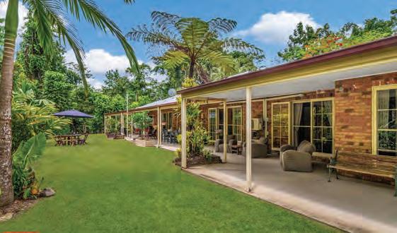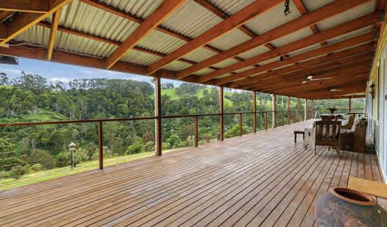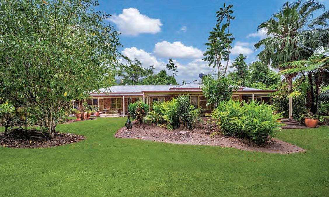 Wrap-around verandas offer expansive views of tropical gardens and rainforest. Interiors include a gourmet kitchen, spacious living areas, and a versatile library/home office. Additional cleared paddocks, established orchards, a machinery shed, workshop, and water features complete this unparalleled retreat magnificently.
