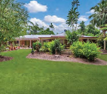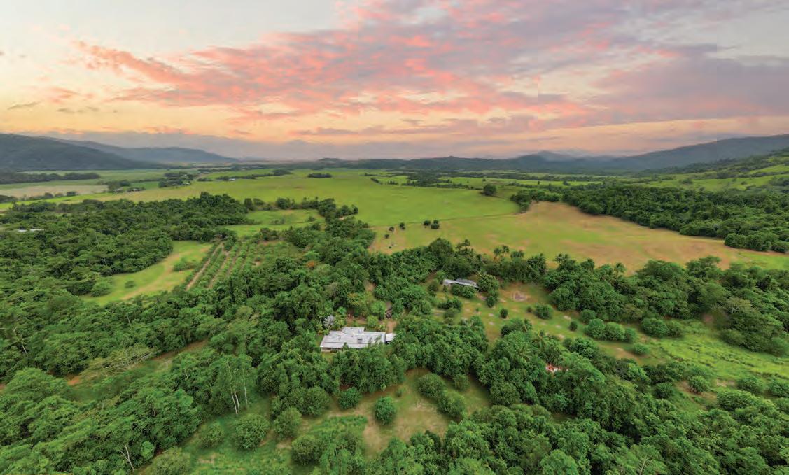 ‘Taville’ is an outstanding 155-acre lifestyle property and private executive sanctuary located south of Cairns, just 20 minutes from Innisfail. The estate features a grand 5-bedroom, 2-bath residence with a 7-car garage set on 62.6 hectares. A private driveway over Wooloogin Creek—flanked by orchards of Tahitian limes, pomelos, and lemonades—leads to the homestead nestled against a mountain backdrop. Wraparound verandas offer expansive views of tropical gardens and rainforest. Interiors include a gourmet kitchen, spacious living areas, and a versatile library/home office. Additional cleared paddocks, established orchards, a machinery shed, workshop, and water features complete this unparalleled retreat magnificently.