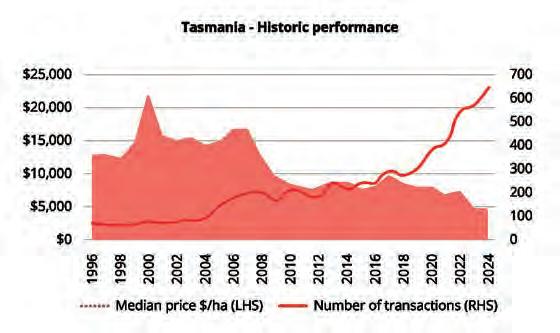 approximately $12,906/ha, while transaction volumes fell by 6.4% compared to the prior year. Notably, a significant number of transactions involved properties under 100 hectares, mainly in Northern Tasmania. In contrast, land values in the North West and South were more stable.