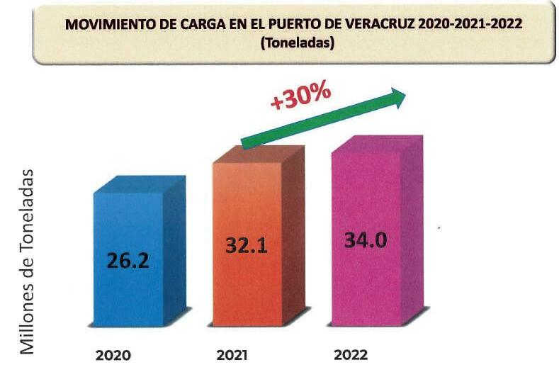 La Administración del Sistema Portuario Nacional Veracruz, ASIPONA VERACRUZ, rompió récord histórico en carga durante este 2022, con el manejo de 34 millones de toneladas. Desde que la Secretaría de Marina asumió la administración de los puertos de México en 2020, el Puerto de Veracruz se ha beneficiado con un crecimiento del 30%.