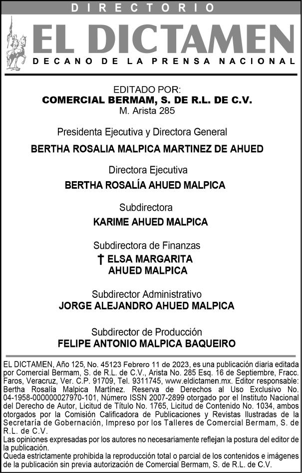 DECANO DE LA PRENSA NACIONAL BERTHA ROSALIA MALPICA MARTÍNEZ DE AHUED - PRESIDENTA EJECUTIVA Y DIRECTORA GENERAL JUAN MALPICA MIMENDI 1960-1998 JUAN MALPICA SILVA 1912-1960 PRECIO $10 www.eldictamen.mx Veracruz, Ver. a Sábado 11 de Febrero de 2023 VISITA NUESTRA PÁGINA