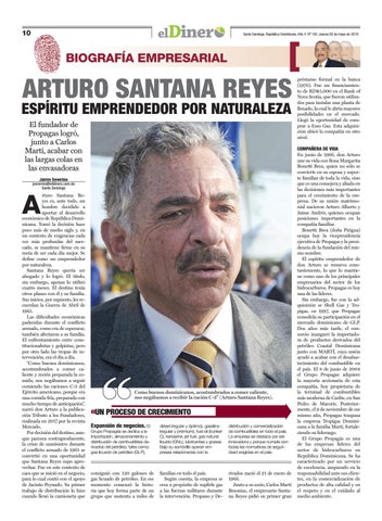 préstamo formal en la banca (1970). Fue un financiamiento de RD$5,000 en el Bank of Nova Scotia, que fueron utilizados para instalar una planta de llenado, la cual le abría mayores posibilidades en el mercado. Llegó la oportunidad de comprar a Esso Gas. Esta adquisición ubicó la compañía en otro nivel. COMPAÑERA DE VIDA En junio de 1966, don Arturo une su vida con Rosa Margarita Bonetti Brea, quien no sólo se convierte en su esposa y soporte familiar de toda la vida, sino que es una consejera y aliada en las decisiones más importantes para el crecimiento de la empresa. De su unión matrimonial nacieron Arturo Alberto y Jaime Andrés, quienes ocupan posiciones importantes en la compañía familiar. Bonetti Brea (doña Pirigua) ocupa hoy la vicepresidencia ejecutiva de Propagas y la presidencia de la fundación del mismo nombre. El espíritu emprendedor de don Arturo se renueva constantemente, lo que lo mantiene como uno de los principales empresarios del sector de los hidrocarburos. Propagas es hoy una de las líderes. Sin embargo, fue con la adquisición se Shell Gas y Tropigas, en 1997, que Propagas consolida su participación en el mercado dominicano de GLP. Dos años más tarde, el consorcio inauguró la importadora de productos derivados del petróleo Coastal Dominicana junto con MARTÍ, cuya unión ayudó a acabar con el desabastecimiento del combustible en el país. El 8 de junio de 2004 el Grupo Propagas adquiere la mayoría accionaria de esta compañía, hoy propietaria de la terminal de combustibles más moderna de Caribe, en San Pedro de Macorís. Posteriormente, el 9 de noviembre de ese mismo año, Propagas traspasa la empresa Tropigas Dominicana a la familia Martí, fortaleciendo su liderazgo. El Grupo Propagás es una de las empresas líderes del sector de hidrocarburos en República Dominicana. Se ha caracterizado por un servicio de excelencia, amparado en la responsabilidad ante sus clientes, en la comercialización de productos de alta calidad y en el respeto y en el cuidado al medio ambiente.