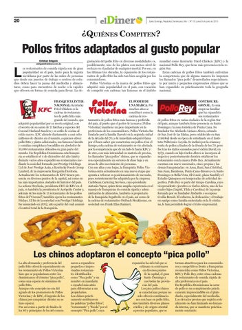 Los chinos adoptaron el concepto “pica pollo” La alta demanda y preferencia del pollo frito ofrecido especialmente en los restaurantes de Pollos Victorina hizo que se popularizara entre los dominicanos el término “pica pollo”, como una especie de sinónimo de pollo frito. Aunque este concepto no era del agrado de los promotores de Pollos Victorina y de KFC, el ingenio de los chinos por conquistar clientes no se hizo esperar. Fue así como a partir de finales de los 80 y principios de los 90 comen-