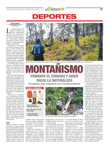 a excursión hacia el Pico Duarte es, quizás, para muchos dominicanos, uno de esos recorridos que se deben hacer aunque sea una vez en la vida. Y no es para menos. Los excursionistas aprenden del trabajo en equipo, el apoyo mutuo y el buen compartir en medio de la naturaleza. “Montañismo” es el término correcto para nombrar la práctica de escalar montañas. Sin embargo, a veces se comete el error de remplazarlo por “alpinismo”, el cual está denominado estrictamente para los Alpes. Así lo explica Antonio Morales, escalador y dueño de la tienda ARM Climbing, especializada en artículos para este deporte. “La máxima altura a la que llegamos en República Dominicana es de 3,085 metros, por lo que aquí realmente no hay montañas, sino senderos. Se practica el senderismo”, explica Morales. Dice que las montañas se dividen en tres: alta montaña (de 6,000 metros en adelante), media montaña (de 4,000 a 6,000 metros) y baja montaña (4,000 metros hacia abajo). Menciona al Pico Bolívar en Venezuela, el cual alcanza los 4,000 metros, como una de las montañas en las cuales suelen iniciarse los aficionados de este deporte por su altura. Para practicar el montañismo, o el senderismo, se necesita una buena condición física. “Muchas personas subestiman el subir un sendero, pero tener un buen sistema cardiovascular y piernas resistentes es primordial”, afirma. Señala que los picos más altos del país comienzan a partir de 1,500 metros. Menciona como los 10 con más altura: Pico Duarte, Loma Barraco, Pico Barraco, Rusilla, Pelona, La Viuda, Loma Fría, Monte Cigua, Monte Tina y Alto Bandera. AYUDA Algunas personas se ayudan de mulas o de otras personas para escalar, práctica de la cual los aficionados tienen distintos puntos de vista. “Hay algunas partes del mundo donde se utilizan porteros que son personas que llevan el equipo de los escaladores. En el punto de vista de ecología y ética, es poner a un animal o persona a trabajar por