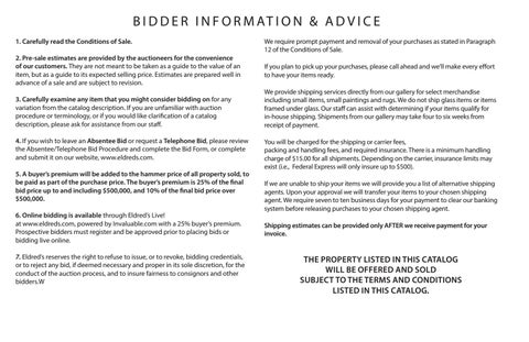 B I D D E R I N F O R M AT I O N & A D V I C E 1. Carefully read the Conditions of Sale. 2. Pre-sale estimates are provided by the auctioneers for the convenience of our customers. They are not meant to be taken as a guide to the value of an item, but as a guide to its expected selling price. Estimates are prepared well in advance of a sale and are subject to revision. 3. Carefully examine any item that you might consider bidding on for any variation from the catalog description. If you are unfamiliar with auction procedure or terminology, or if you would like clarification of a catalog description, please ask for assistance from our staff. 4. If you wish to leave an Absentee Bid or request a Telephone Bid, please review the Absentee/Telephone Bid Procedure and complete the Bid Form, or complete and submit it on our website, www.eldreds.com. 5. A buyer’s premium will be added to the hammer price of all property sold, to be paid as part of the purchase price. The buyer’s premium is 25% of the final bid price up to and including $500,000, and 10% of the final bid price over $500,000. 6. Online bidding is available through Eldred’s Live! at www.eldreds.com, powered by Invaluable.com with a 25% buyer’s premium. Prospective bidders must register and be approved prior to placing bids or bidding live online. 7. Eldred’s reserves the right to refuse to issue, or to revoke, bidding credentials, or to reject any bid, if deemed necessary and proper in its sole discretion, for the conduct of the auction process, and to insure fairness to consignors and other bidders.W