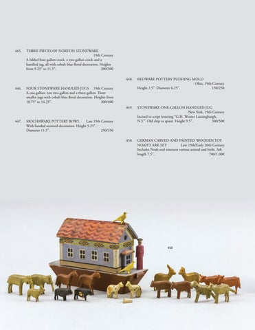 THREE PIECES OF NORTON STONEWARE 19th Century A lidded four-gallon crock, a two-gallon crock and a handled jug, all with cobalt blue floral decoration. Heights from 9.25” to 11.5”. 200/300 448.
