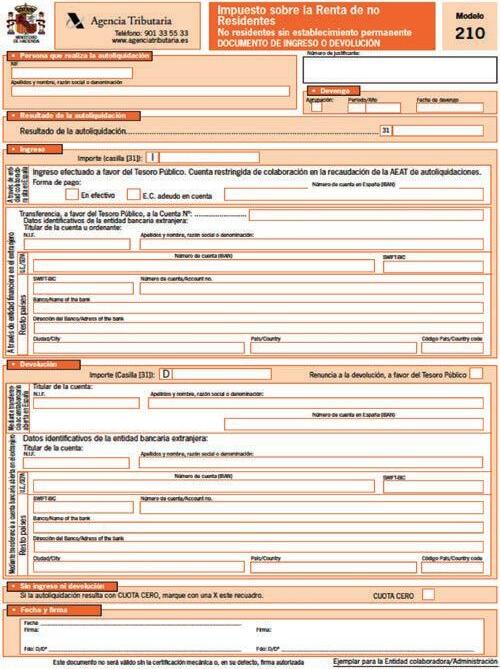 n last weeks the Spanish Inland Revenue (Agencia Tributaria) has been carrying out a new campaign to look for and identify those NON-RESIDENTS who own real estate properties in Spain but have not submitted the Tax returns The Tax Returns that all Non-Resident Property owners should be submitting annually is called, Modelo 210, and the pe riod for submitting this declaration is the calendar year, (i.e. 1st Ja nuary to 31st December each year). The Annual Deem Income Tax due for the tax year 2021, must be paid before the 31st De cember 2022.