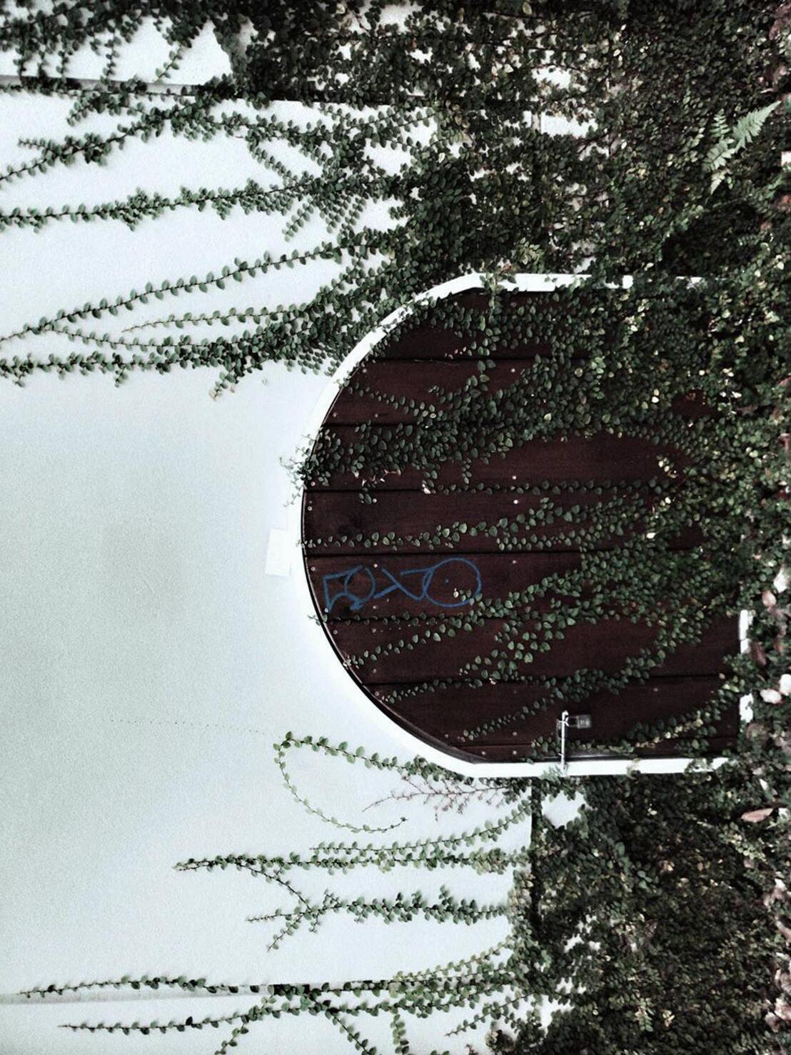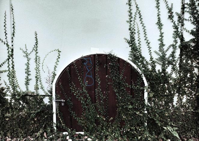 灰色斑駁、人去樓空的建築,最上 方圓型且帶花紋的造型,對比身旁 平穩沒有特色的平房,如同象徵擁 有高人一等的地位般,現在內部整 個打空,縫隙中溢出了新的綠色生 命,那樣的姿態,就像在期待著下 個,讓他繼續延存呼吸的孩子般。