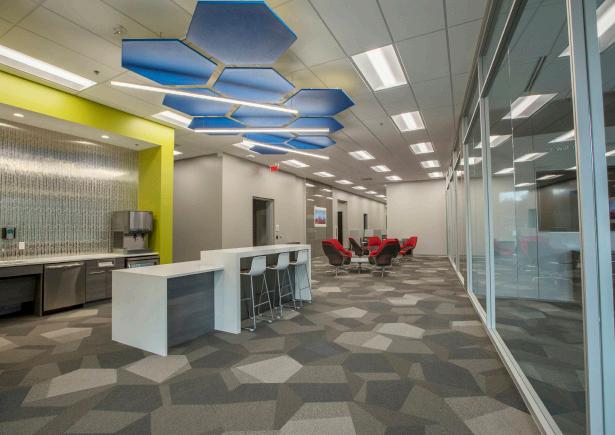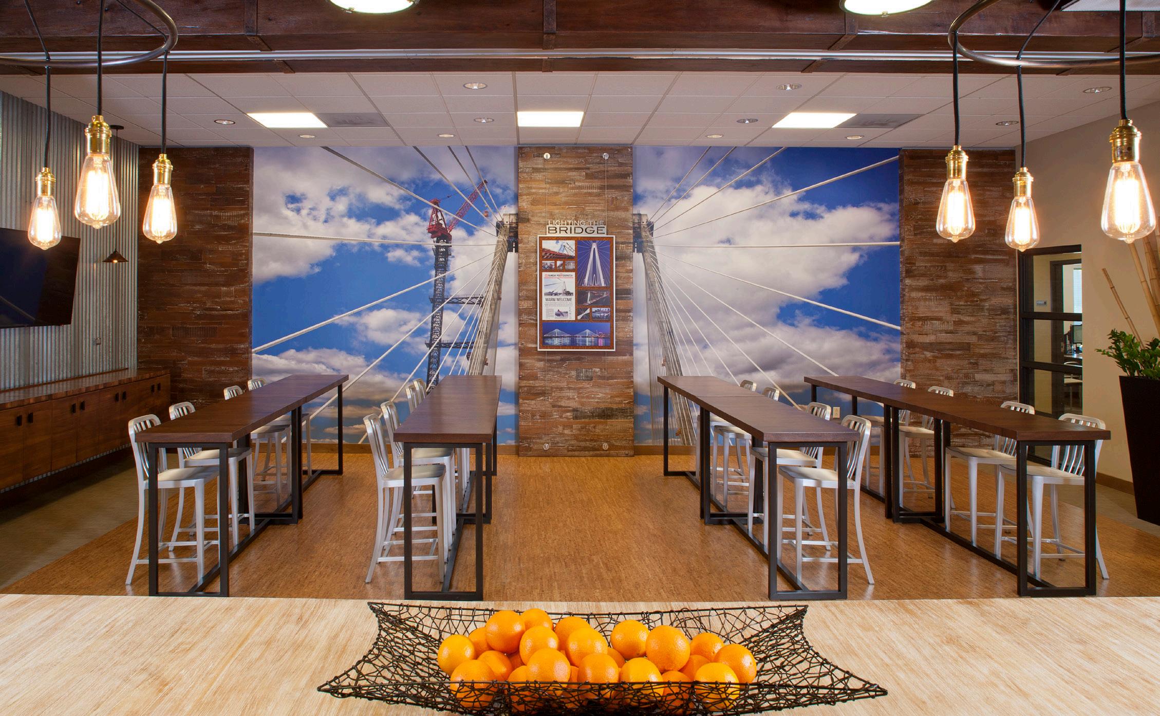 Awarded one of the “Top Workplaces in 2016” by the St. Louis Post Dispatch, this electrical contractor’s workplace is not your “typical” looking office. The CEO treats his employees like family and desired a café and a conference room that felt like “home” a place to gather around the table at the beginning or end of a long day, a place to collaborate and include their peeps from around the country that might be out on remote job sites,,,,, and a place to celebrate their accomplishments. The redesign of their “Main Feeder” the name of their main café and the creation of a conference room named “Louie” an homage to the company’s Founder helped bring that residential comfortable feeling into their office.