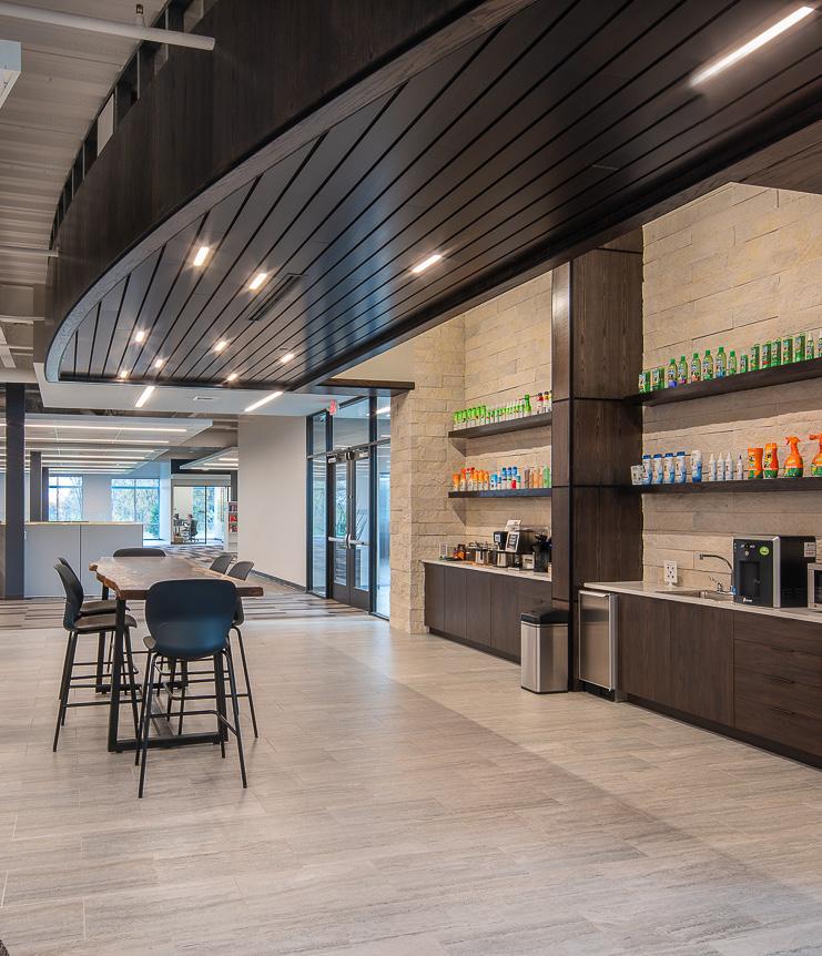 The world headquarters for Cosmos Corporation, located in St. Peters, MO, is a family-owned company and a leader in the pet industry. O’Toole was asked to provide a space that reinforces the owner’s mission of using natural ingredients in their product manufacturing. Stone and wood permeate the open office floor plan along with a living plant wall that becomes a welcoming focal piece. Workspace panel heights were lowered allowing greater access to natural light and increasing the interaction among staff.