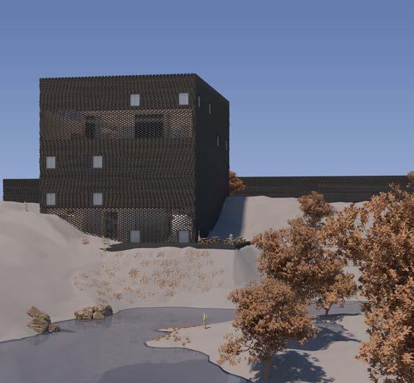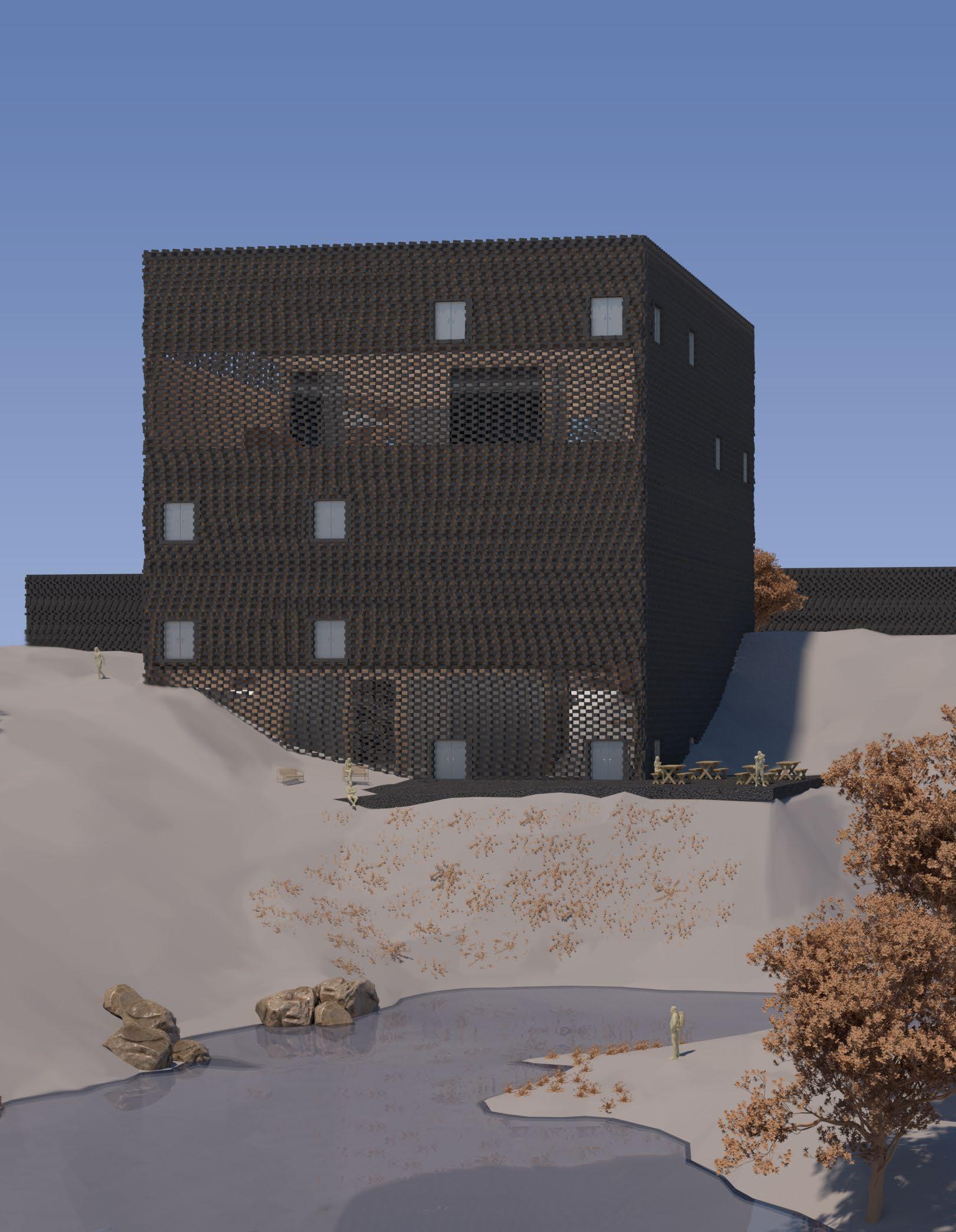 The facade of the building is composed of strategically placed CMU blocks acting as a solid net encompassing the structure. Land, and birds, can penetrate the facade, blurring the lines of interior and exterior, and create new architectural experiences as time goes on and the quarry continues to be filled. Doors on every floor ensures usability in every possible situation.
