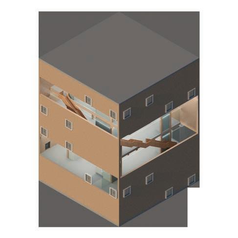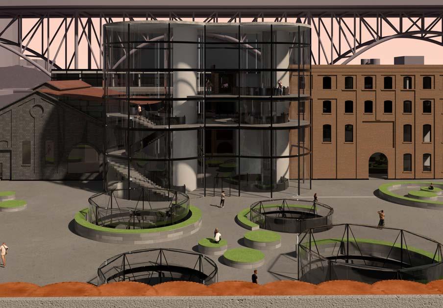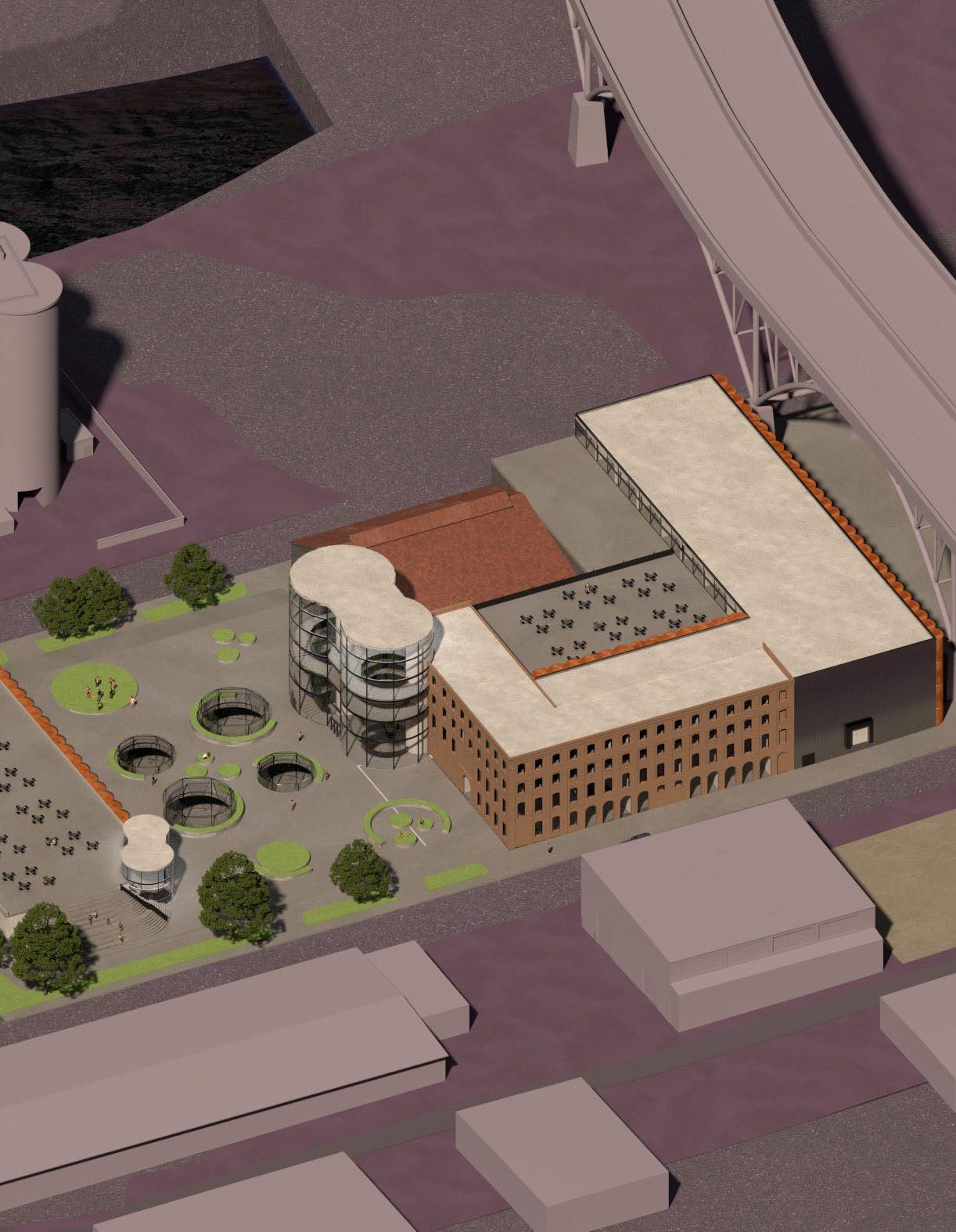The Cleveland School of Media Arts was assigned to a site with five existing buildings occupying the area. Two were utilized within this proposal, and the rest of the program was defined by new construction. In this design, inspired by the adjacent silos of Lafarge North America, the project became characterized by tall glass silos that functioned as a hierarchy of entries and methods of allowing natural light into an unexpected space: underground.
