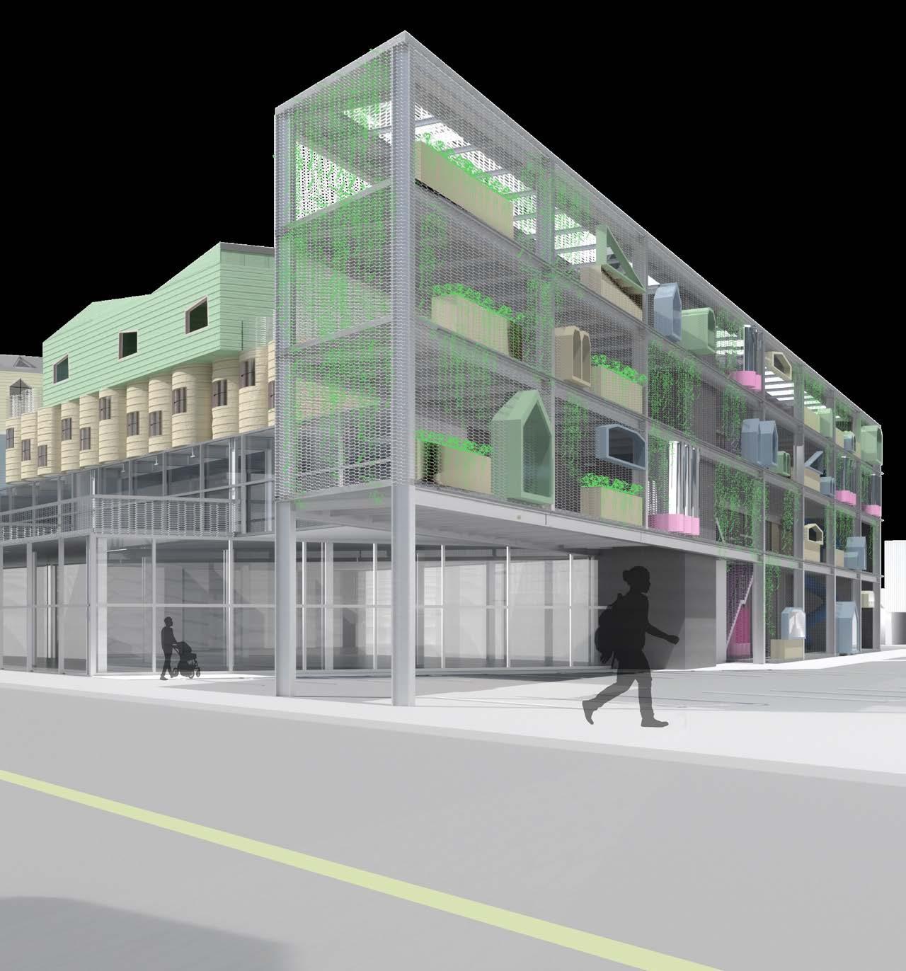 The design of (sub)URBAN COMMONS is primarily driven by existing site factors and the desire to create open, lightweight green spaces for the mixed-use grocery and residential building in the Mission District of San Francisco. In an affordable housing project, it is important to consider the needs of the user beyond basic shelter. One notable need is more green space, which is key to healthy living in dense areas. As a result, we’ve developed a project with key “zones” of existing. The Commons is the crux of these zones, as a large vertical garden with several moments of play and interaction. The Neighborhood extends from the commons to act as circulation of the housing units. Its facade and design emulates the Commons, encouraging a sense of community for residents. Lifestyle encapsulates the spaces that enrich the lives of urban residents: a grocery store and open market, a fitness center, a lounge, and a public terrace. With different geometries, colors, and scales to define the units, each resident gains a sense of home within a dense living style. The mixed-use housing project in who le blends suburban and urban elements into one project. There are elements of streets, of backyards and gardens, of homes with “personal touches” but there’s also ease of access to facilities like markets and fitness centers, all within one site.