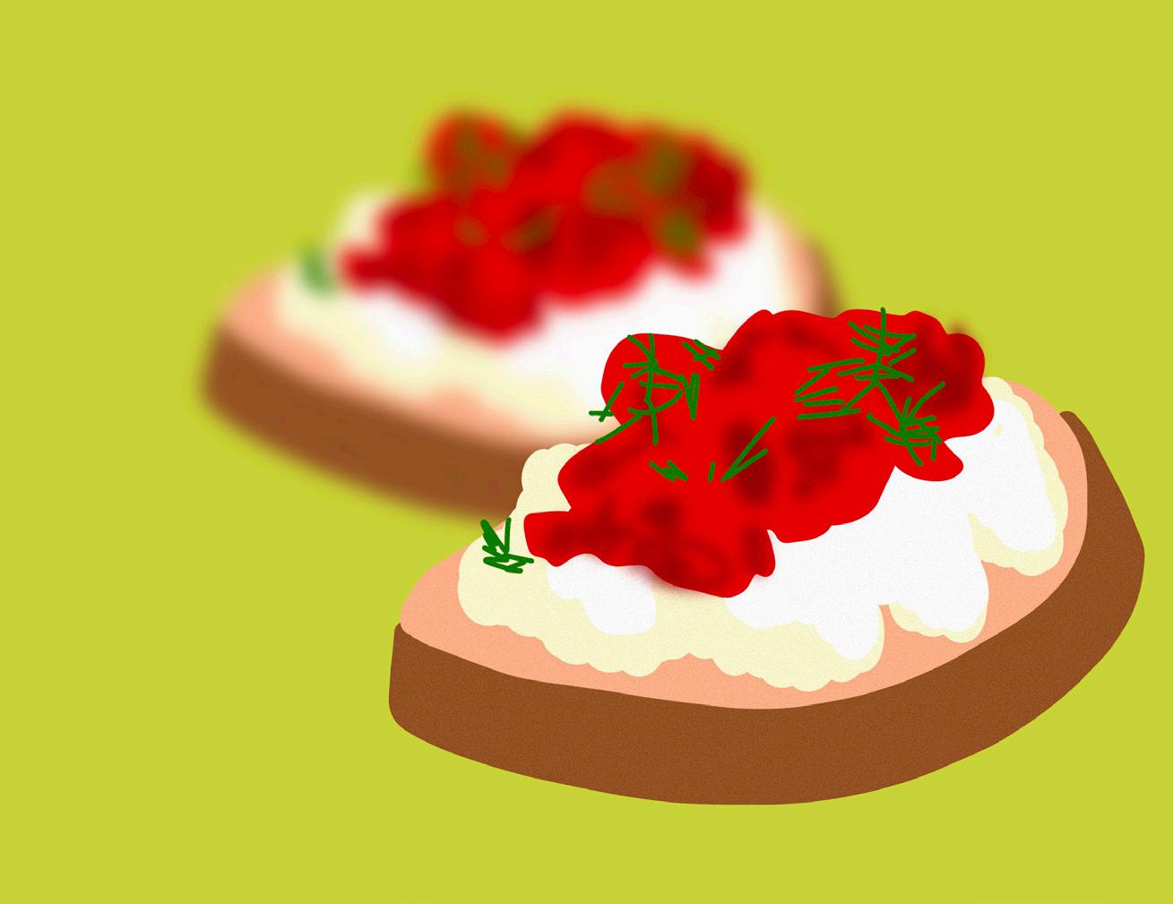 III. Égouttez les tomates et coupez-les en dés. Déposez-en une cuillère sur chaque toast.