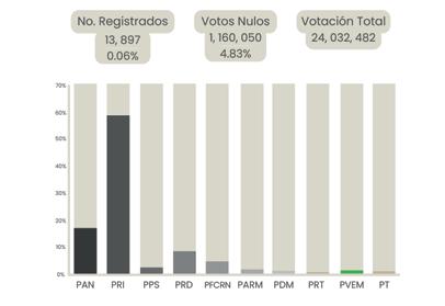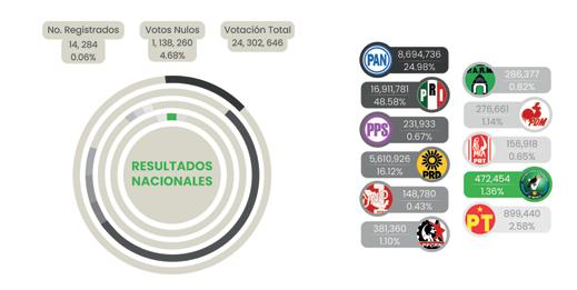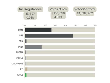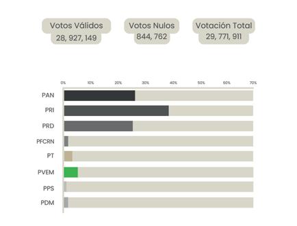 Por su parte, la conformación de la Cámara de Senadores fue así: 1 Senador de Mayoría Relativa para el Partido Acción Nacional y 31 de Mayoría Relativa para el Partido Revolucionario Institucional6. Conforme al resultado en las elecciones de 24,302,646 total de votos sufragados válidos, 87,787 casillas, 62,169 secciones, 14,284 votos no registrados, 1,138,260 votos nulos, el Partido Verde Ecologista de México obtuvo 326,251 votos correspondiente al 1.34 porcentual.7