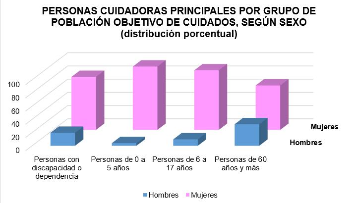 Refleja que las cuidadoras principales de los infantes de 0 a 5 años fueron la madre con un 86.3% y la abuela con 7.6%; de las personas adultas mayores con alguna discapacidad o dependencia, la persona cuidadora principal fue su hija o nieta, con 44.3%; cónyuge o pareja, con 29.4%, e hijo o nieto, con 13.8%. Para las personas adultas mayores que no tiene discapacidad