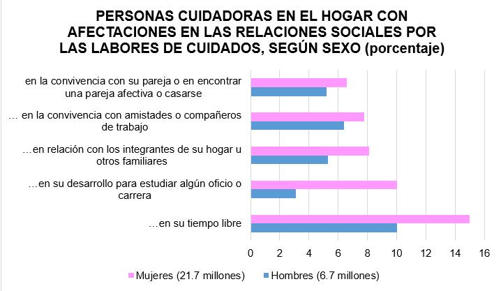 Por cuanto hace al tiempo que cada género dispone para los cuidados y labores del hogar; las mujeres dedican hasta 37.9 horas semanales, mientras que los hombres solo 25.6 horas a la semana; teniendo una diferencia de hasta 12 horas; el 51.1% de las mujeres cuidadoras principales reconocieron tener en promedio 30.4 horas de trabajo remunerado a la semana, mientras que el 82.7% de los hombres cuidadores principales dedicaron 40.5 horas a la semana de trabajo remunerado; es decir, las mujeres se ven obligadas a sacrificar más tiempo de la vida laboral para dedicarlo a las labores domésticas o de cuidados mientras que los hombres pueden seguir desarrollándose en