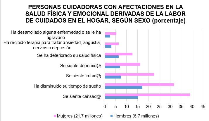Toda vez que son las mujeres quienes cumplen con más horas dedicadas al hogar, así como a los cuidados de los diferentes grupos ya mencionaos, es más que obvio que el desgaste físico y psicológico será mayor para ellas; pues 39.1% de las mujeres cuidadoras señalaron que debido a los cuidados que brindan se sienten cansadas, seguidas por otras afectaciones como disminución de tiempo de sueño con 31.7% y sentirse irritada con 22.7%. Asimismo, 16.3% informó sentirse deprimida y 12.7% ha visto afectada su salud física. Para los hombres que brindan cuidados, las mayores afectaciones fueron la disminución de su tiempo de sueño con 17.3 %, seguida por sentirse cansado con 15.2% y sentirse irritado con 7.4%.