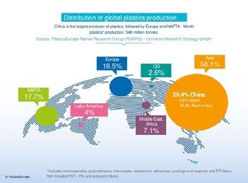 De la producción total de plásticos a nivel mundial, Asia concentró el 50,1%. En este continente destaca el papel de liderazgo jugado por China, que concentró el 29,4% de la producción mundial. Japón se situó en segundo lugar con un 3,9%.
