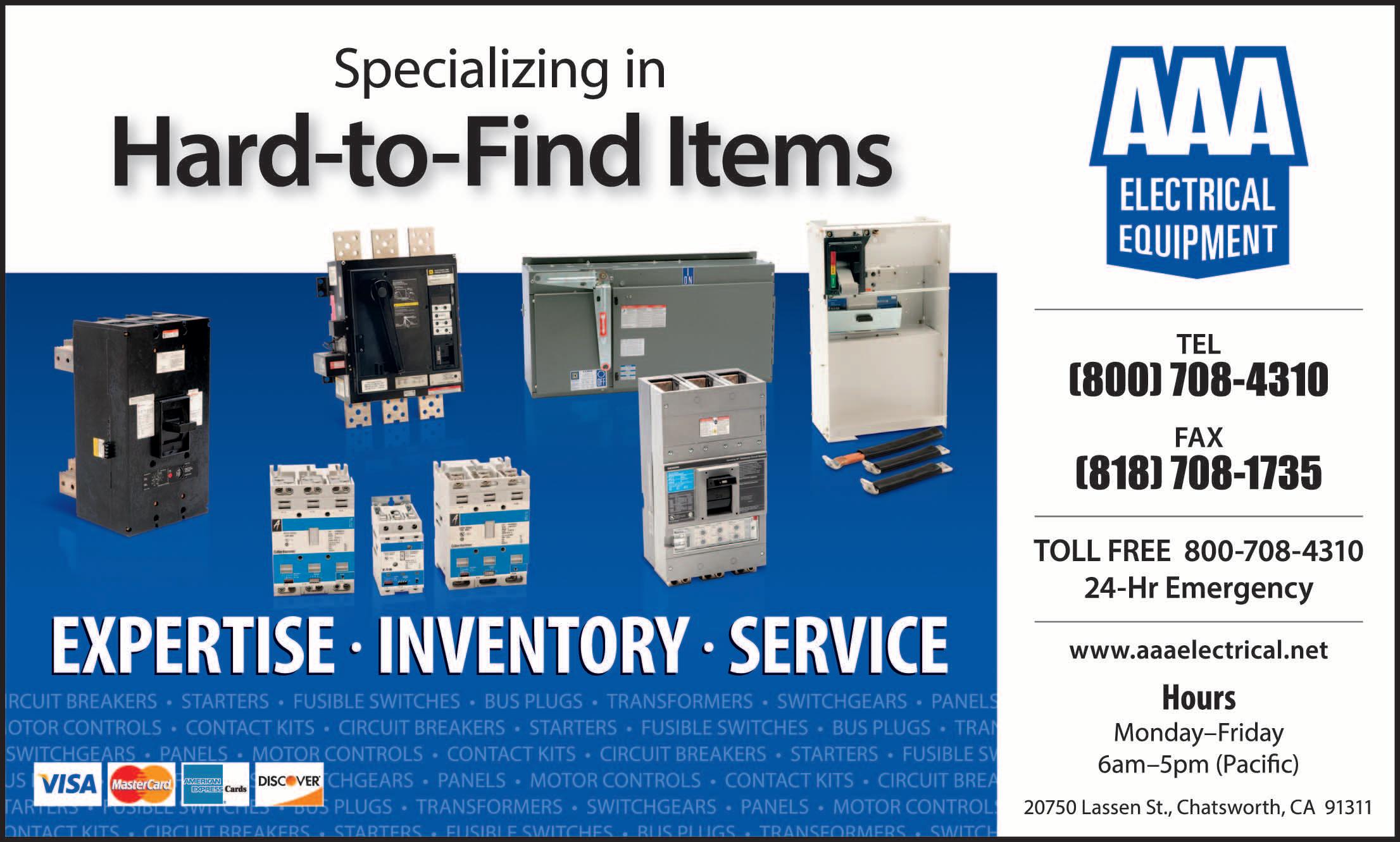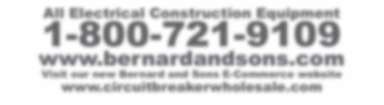 Established 1987 All Electrical Construction Equipment 1-800-721-9109 www.bernardandsons.com Visit our new Bernard and Sons E-Commerce website www.circuitbreakerwholesale.com 7630 Densmore Ave Van Nuys, California 800-721-9109 315 E. Pioneer Street Phoenix, Arizona 602-243-0200 www.abreakerco.com BERNARD & SONS CIRCUIT BREAKERS Molded Case Circuit Breakers Transformers Panel Boards Switchgear Starters Disconnects Bus Plugs MCC Buckets & MORE We Specialize in New-USED & Obsolete Equipment NATIONWIDE DISTRIBUTOR New Location, New Inventory & New Sales Associates www.bernardandsons.com