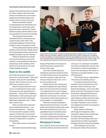 CONTINUED FROM PREVIOUS PAGE replicate the beneficial equine movement for clients unable to ride a full-sized animal or limited by time and location; equipment that helped support and balance riders on a horse; and more. Menke immediately realized incorporating the new technology into the riding lessons and therapy vastly improved clients’ experiences. Clients became stronger and were able to move more quickly to the next level of therapy. The prototypes also provided biofeedback data on the physical and cognitive status of the riders. That measurable feedback is the Holy Grail needed to advance therapeutic riding. “All the puzzle pieces started coming together at the same time,” Menke said of her nursing degree and the research and feedback brought in by Rose-Hulman. “What I’ve learned from nursing school and from being a nurse is the rationale. I need rationale for why we’re