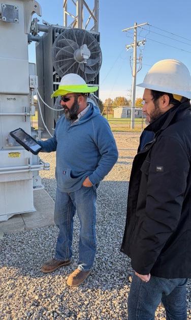 While on the job at a substation, Hoosier Energy Substation Working Foreman Jared Bartlett, left, and GIS/EAM Coordinator Jason Santana access GIS information on an iPad.