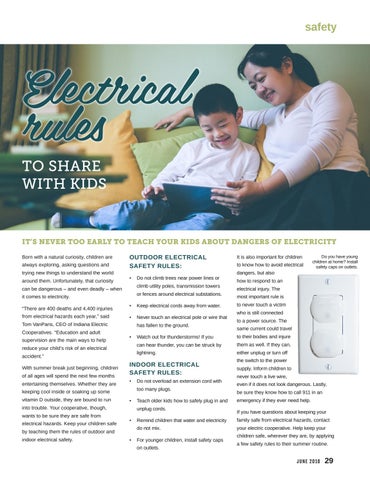 IT’S NEVER TOO EARLY TO TEACH YOUR KIDS ABOUT DANGERS OF ELECTRICITY Born with a natural curiosity, children are always exploring, asking questions and trying new things to understand the world around them. Unfortunately, that curiosity can be dangerous – and even deadly – when it comes to electricity. “There are 400 deaths and 4,400 injuries from electrical hazards each year,” said Tom VanParis, CEO of Indiana Electric Cooperatives. “Education and adult supervision are the main ways to help reduce your child’s risk of an electrical accident.” With summer break just beginning, children of all ages will spend the next few months entertaining themselves. Whether they are keeping cool inside or soaking up some vitamin D outside, they are bound to run into trouble. Your cooperative, though, wants to be sure they are safe from electrical hazards. Keep your children safe by teaching them the rules of outdoor and indoor electrical safety.