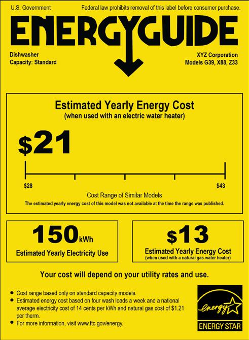 The EnergyGuide label is required to be placed on all appliances by the manufacturers. The label provides information about energy consumption, and shows you how much energy an appliance uses compared with similar models. Keep in mind that the numbers represent averages; actual costs may vary slightly depending on your specific energy use. The label shows the following: