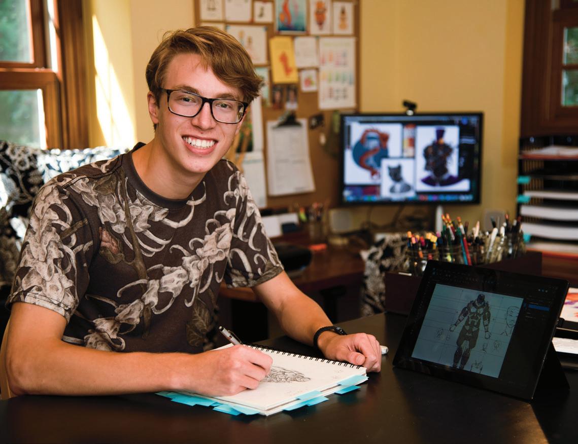 Andrew draws from both his parents for his artistic inspiration, and not just subject matter. His mom’s a freehand artist and graphic designer who loves illustrating people while his dad is a mechanical engineer who works with computer design in the high-tech