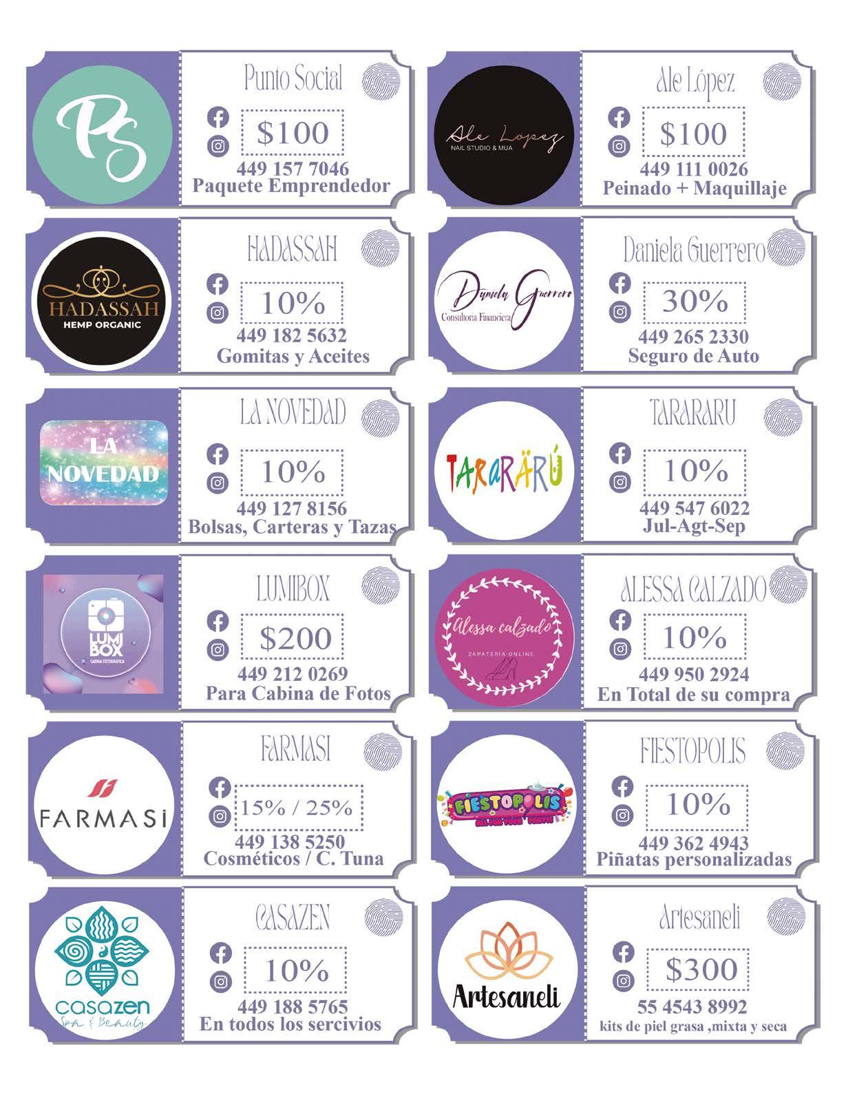 Aprovecha los descuentos que las emprendedoras locales tienen para ti, presenta los cupones de tu interés en sus establecimiento y apoya al comercio local.
