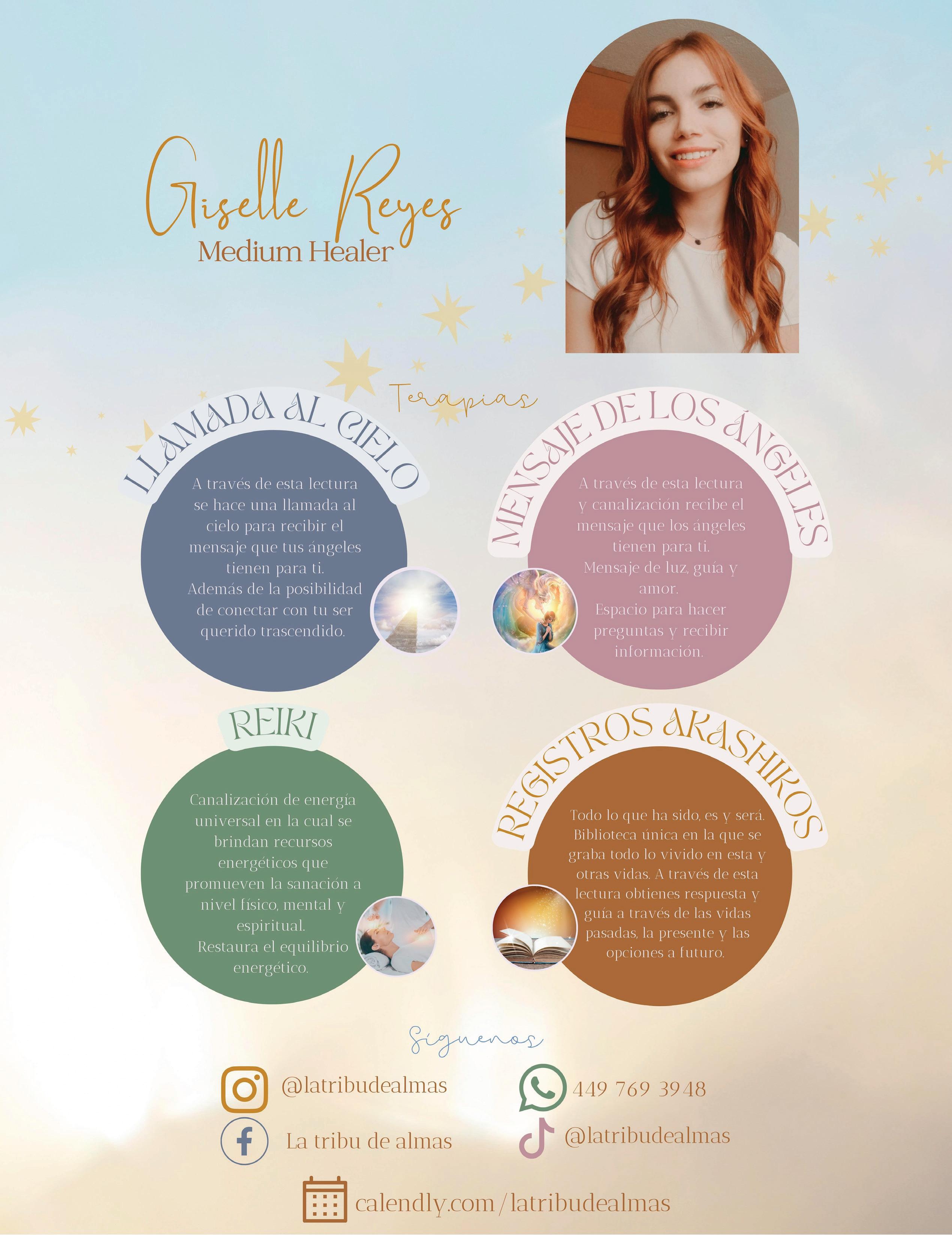 Como trabajadora energética, Giselle se define como una persona de luz y amor que ayuda a otras a conectar con sus seres queridos trascendidos y ángeles, mediante una llamada al cielo.