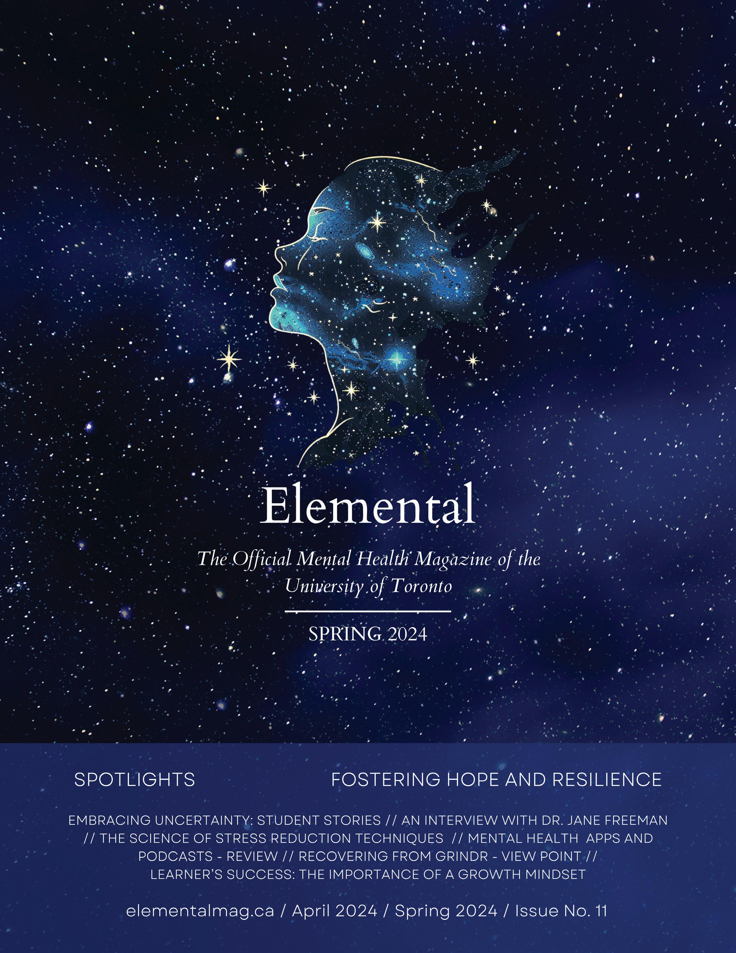 We are excited to present the 11th edition of Elemental Magazine, the University of Toronto’s official tri-campus mental health magazine. For this edition, we wanted to focus on the resiliency of our graduate student writers and share their stories of hope and resilience. As such, this special edition includes stories for our team of journalists and their journey of mental health and recovery. The theme for this issue is Fostering Hope and Resilience.