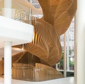 Abercrombie Business School, Sydney, Australia: The nondescript name of “Atrium Stair No. 4” belies the intricacy of this five-level spiraling staircase in a business school building designed by Woods Bagot. When asked to install the staircase’s external cladding, the designer initially manufactured a prototype of 10 stairs and a landing section that was fully clad in the finished panels, showing all joint details, panel finishes, colors, lighting details and shadow line dimensions. A major challenge was ensuring that a consistent curve in three dimensions was achieved across all levels; the prototype was measured using a 3D scanner to determine how the design intent could be achieved. Silky oak timber veneer cladding forms the external faces of the stair, with LED lighting installed to the top of the inside balustrade.