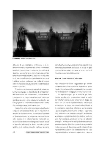 obtención de una recompensa o retribución es el sistema mesolímbico dopaminérgico. Dicho sistema está constituido por un grupo de neuronas productoras de dopamina que se originan en el área tegmental ventral o también denominada área A 10.1 Este sitio se encuentra en el cerebro medio y envía proyecciones hacia la parte frontal del cerebro, mediante el haz medial del cerebro anterior; una de las estructuras donde hace blanco es el núcleo accumbens.2 El núcleo accumbens es otro ejemplo de una estructura funcional ya que en él se integran de forma primordial la retribución y el reforzamiento, que después se transformarán en conductas de búsqueda o evitación cuando se asocian a otras estructuras funcionales que van agregando no solamente calidad sensorial o qualia, sino complejidad en el nivel cognoscitivo. Hasta ahora se ha esbozado una estructura funcional que es la base de conductas que se encuentran en la norma de todo ser humano. A continuación plantearé un eje en cuyo centro se encuentran los mecanismos antes citados, en un extremo la avidez irrefrenable por las conductas de recompensa ligadas al placer, la cual se denomina adicción; y en el otro, una patología psiquiátrica en la cual se encuentra implicada la misma