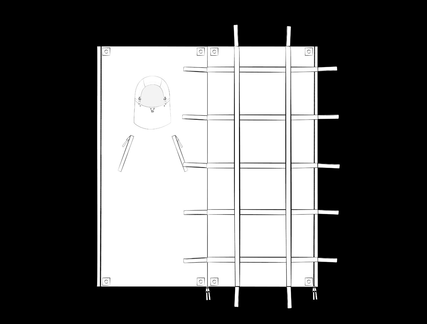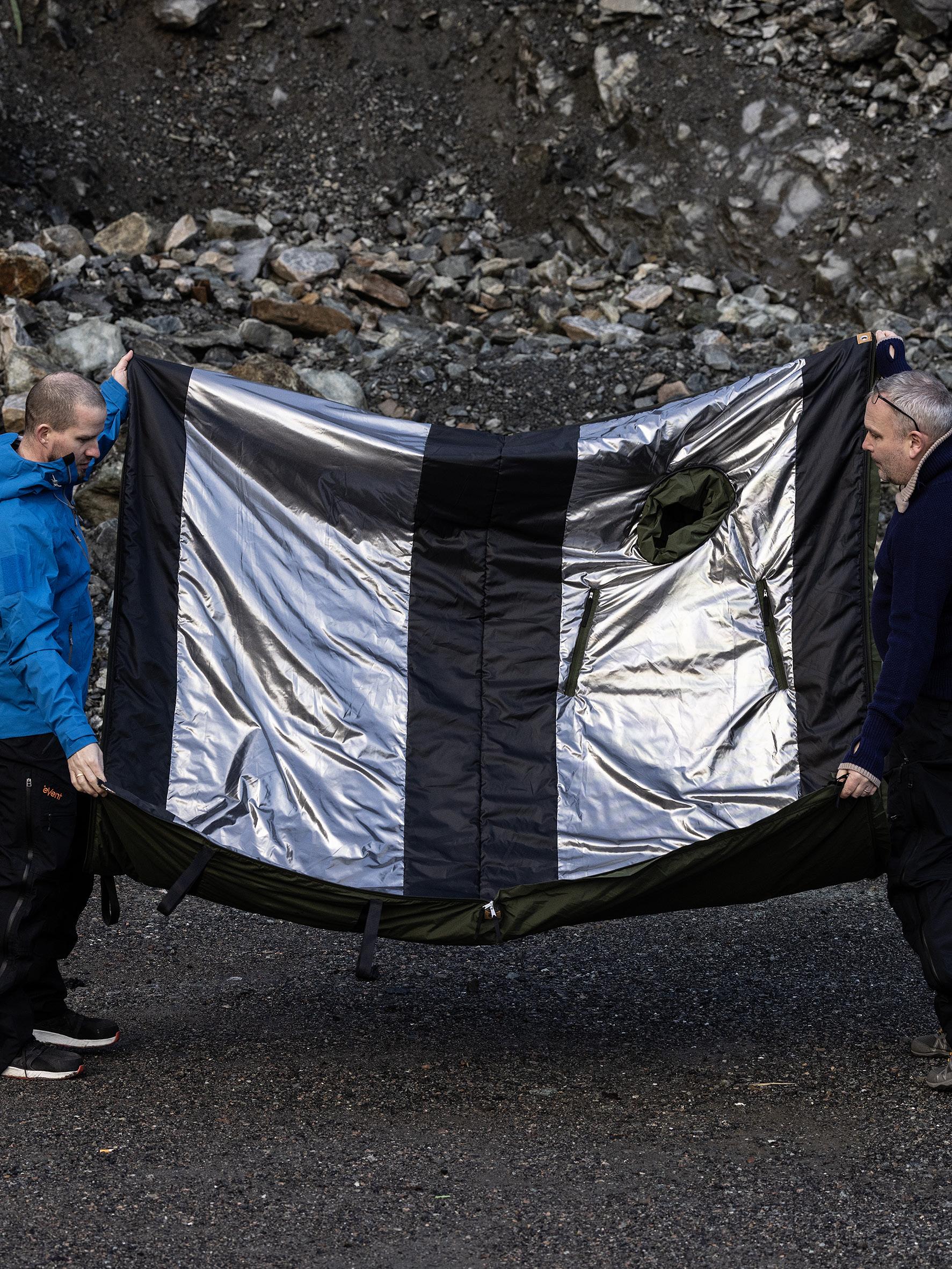 The unfolded tarp can be set up as a tarp/lean-to shelter by using the metal rings as attachment points for suspension. There is the possibility to attach multiple tarps together with zippers both in width and length, depending on the need.