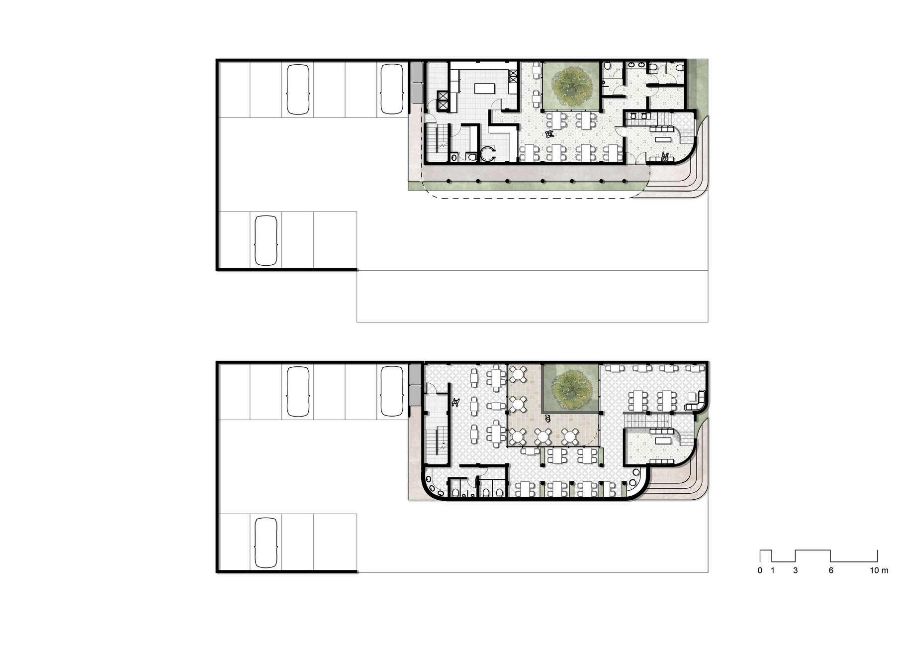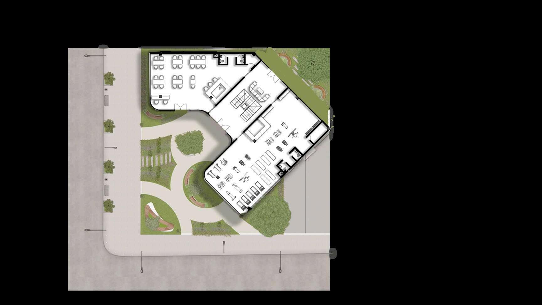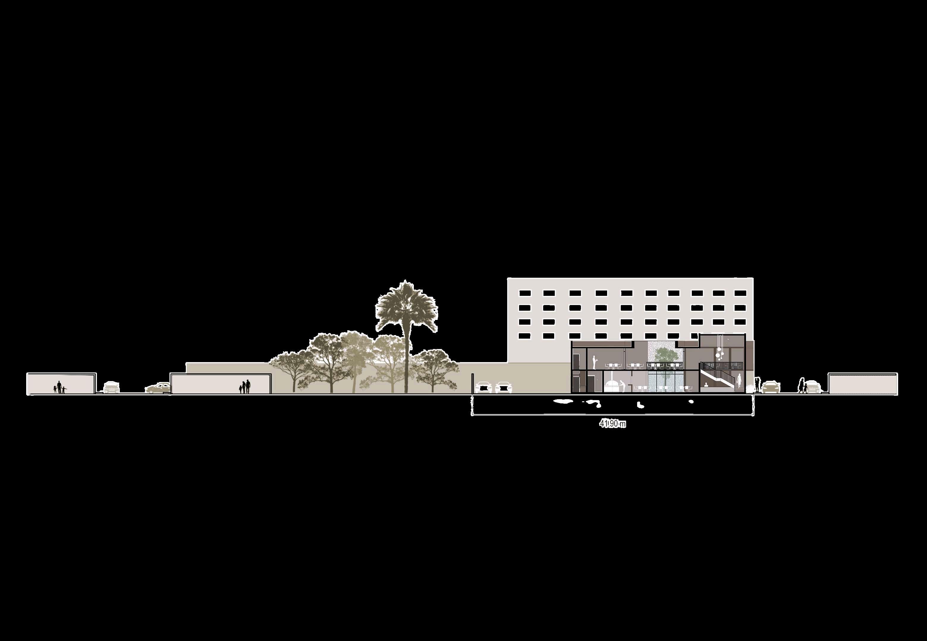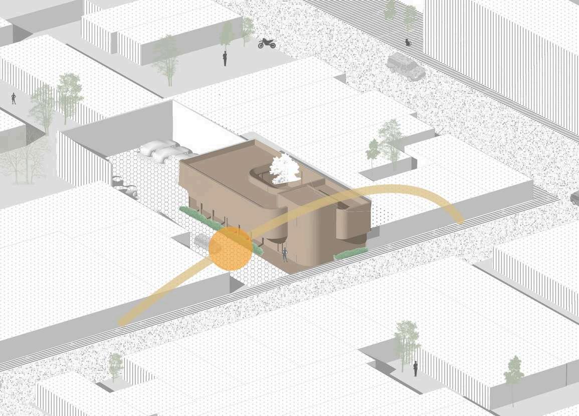 Beingacommercialestablishment,thebuildingmust captureattentionfromtheexteriorandinvitepotential usersinside.Therefore,oneofthemostessential premisesoftheprojectwastotakethesouthwest facadeasthemainprotagonist.Thisisbecause, thankstotheadjacentrightofwayandthedirectionof trafficflow,itallowsforabroaderviewtowardsthe building.Thisledtopositioningtheparkingandservice areaattherear,anditisthroughthecorridorofarches andvegetationthatthebuildingaccompaniesvisitors ontheirjourneytowardstheentrance.