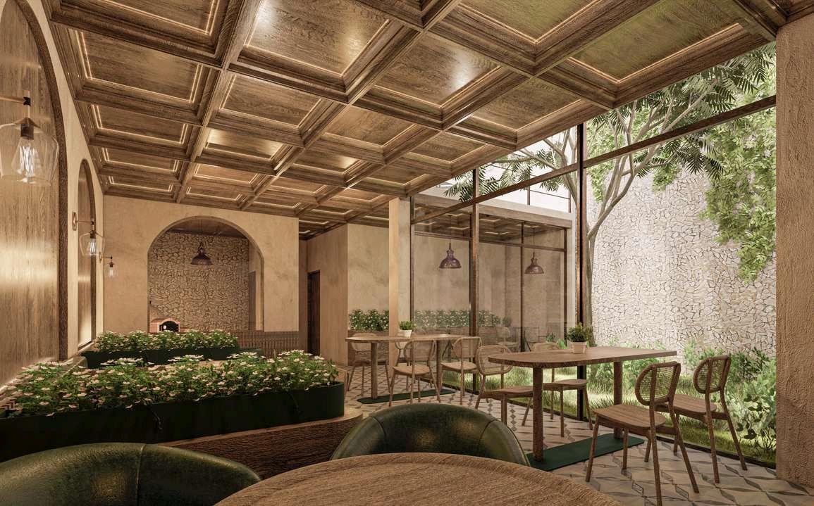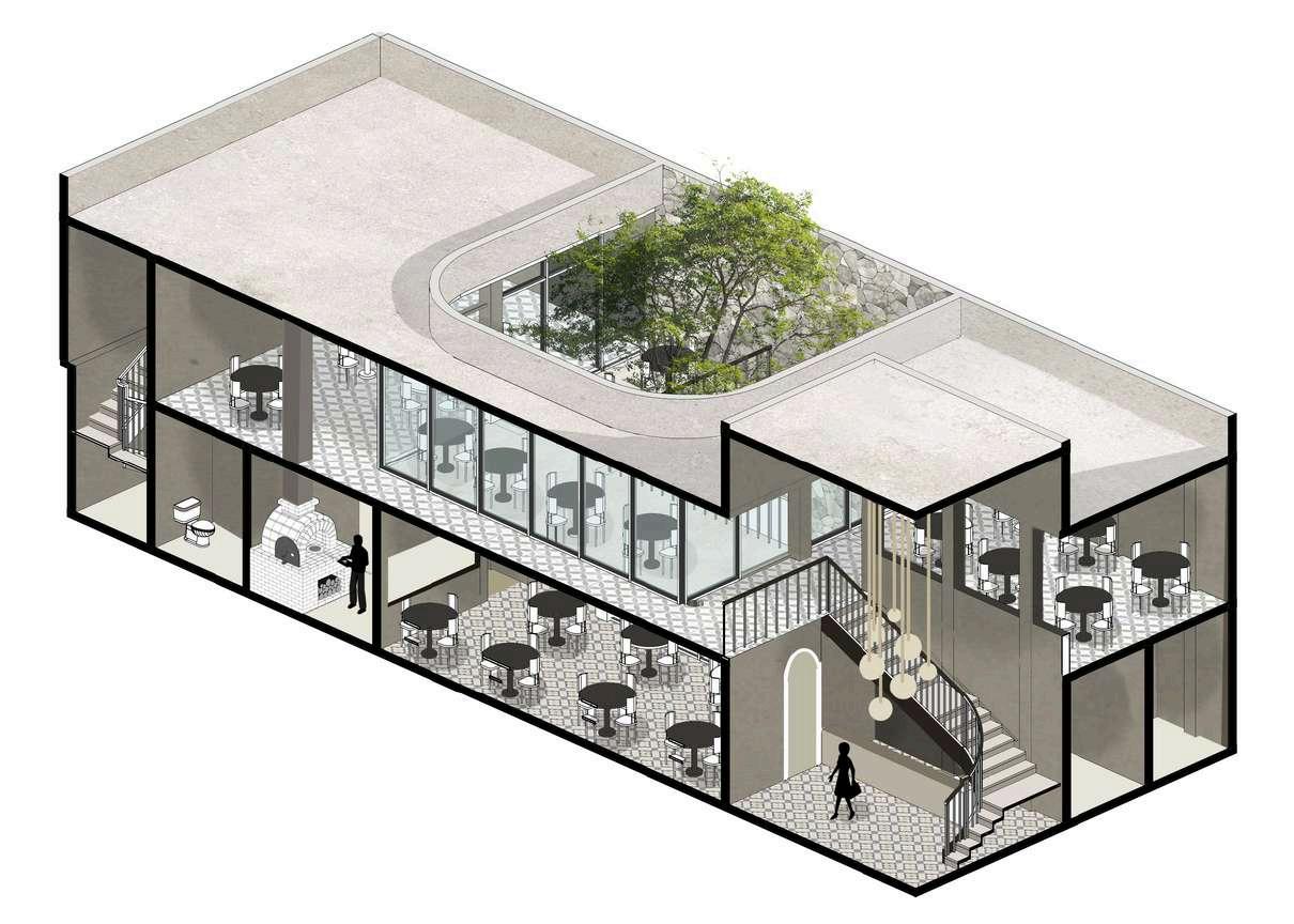 Theuseofnaturalandneutralmaterialssuchasbrick,stone andwhitecolorallowstherestaurantto relatetoItaliancuisine.Atthesametime,itoffersadaptabilityfordifferenttypesofgastronomy,as thesefinishesareflexibleandacknowledgethevolatilityofcommercialbusinesses.