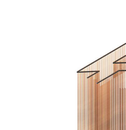 The steel wire cables are added vertically to the facade to hold up the horizontal recycled plywood louvers. The louvers are different triangular forms for controlling the wind affecting the facade.