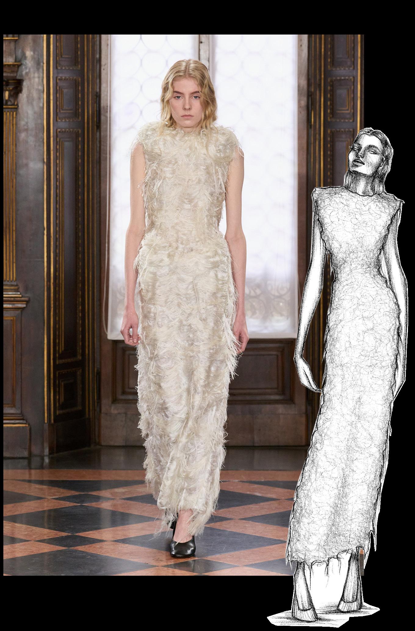• Abito in fibra di latte con tagli verticali modellanti, cuciti a rovescio con i margini di cucitura rivolti verso l’esterno.