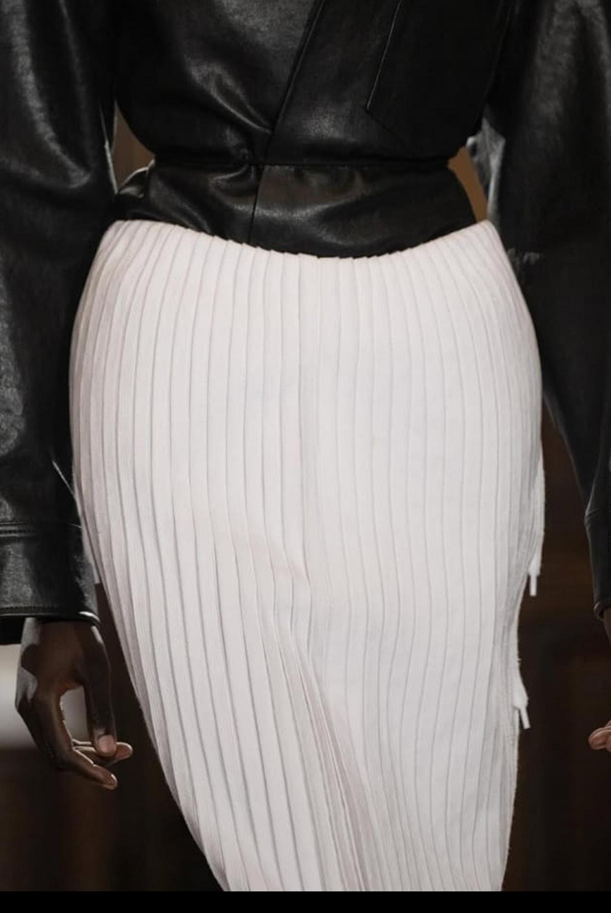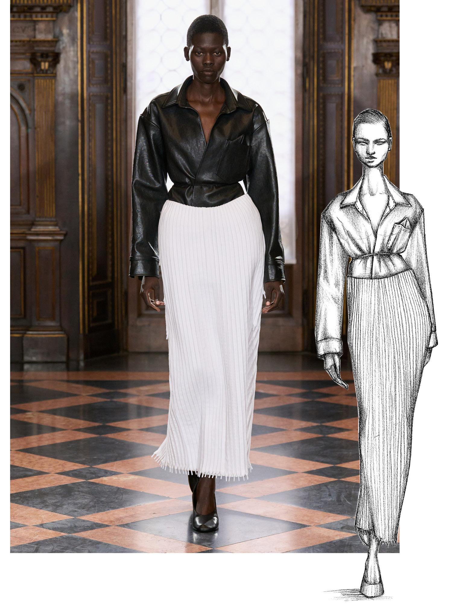 • Realizzazione del cartamodello per una gonna in pelle, seguendo le indicazioni del direttore creativo. La struttura prevede una forma a ruota sul davanti, con linea dritta sul retro, tenendo conto dell’inserimento di tagli orizzontali, necessari per il materiale scelto.
