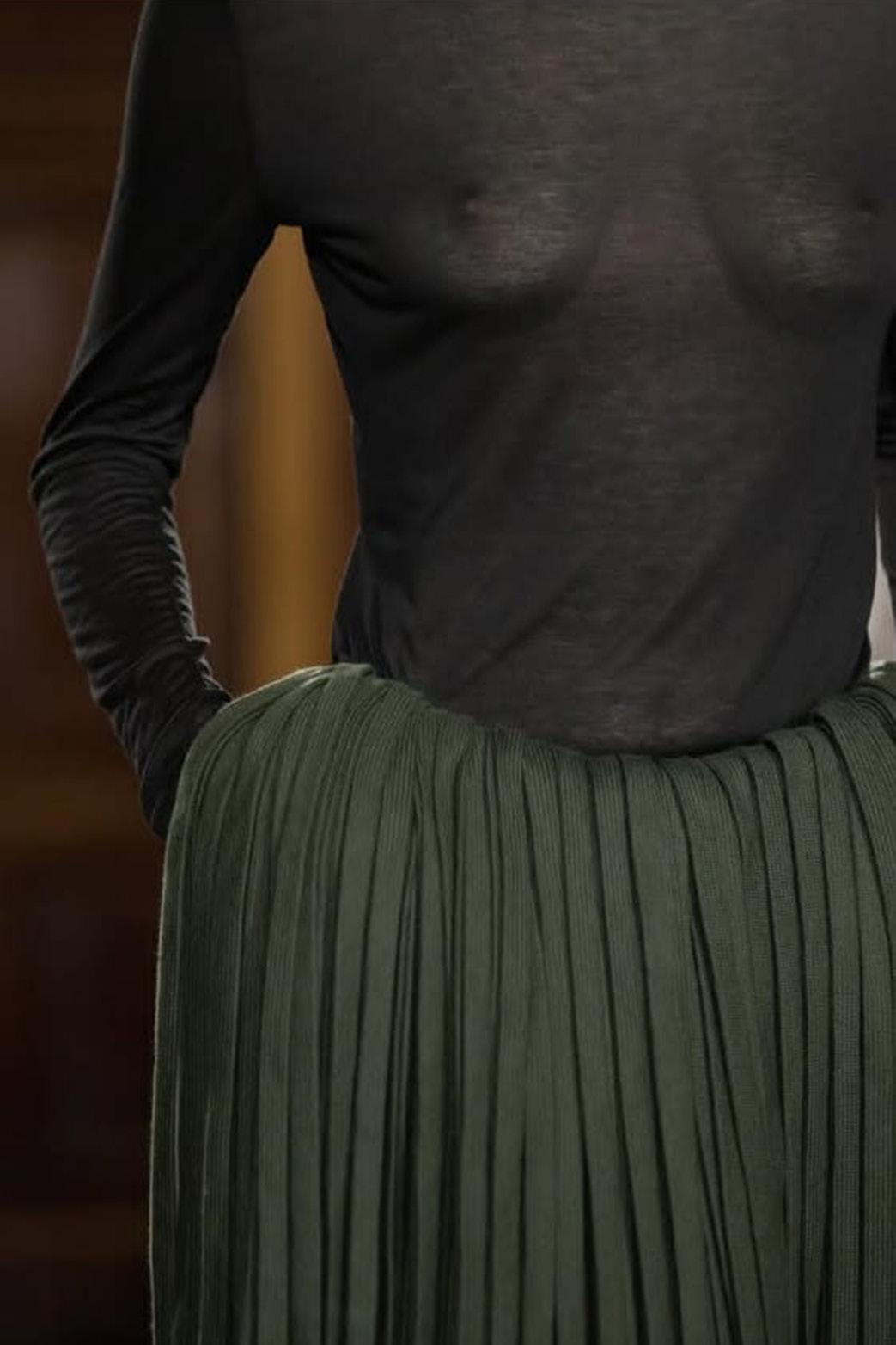 • Gonna in viscosa con struttura a mezza ruota, caratterizzata da un ampio movimento. Il tessuto è ripreso in più punti sulla fodera mediante cuciture a mano, creando un effetto drappeggiato e dinamico.